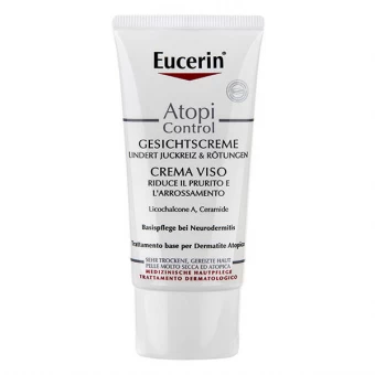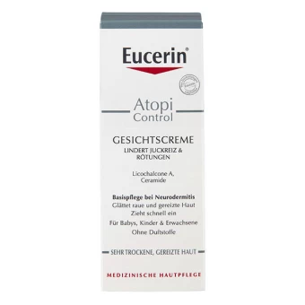 Die Eucerin AtopiControl Gesichtscreme ist zur Beruhigung und Stärkung atopischer Haut geeignet. Die leichte Pflegeformel mit 12 % Omega-6-Fettsäuren und Licochalcone A. ist ideal zur Behandlung von trockener und rissiger Haut in symptomfreien Phasen der Neurodermitis. Zudem lindern die natürlichen Inhaltsstoffe Juckreiz und Rötungen der Gesichtshaut und stärken die Hautbarriere. Die Creme zieht schnell ein und bildet eine ausgezeichnete Basis für das Make-up. Dermatologische Studien bestätigen die sehr gute Hautverträglichkeit bei Neurodermitis und atopischer Haut. Die Eucerin AtopiControl Gesichtscreme ist parfümfrei und ohne Farbstoffe und Parabene. Sie ist für Erwachsene, Kinder, Babys und für Kontaktlinsenträger geeignet. In akuten Phasen der Neurodermitis sollte die Eucerin AtopiControl Akutpflege Creme verwendet werden.