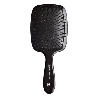 Professionelle 13-reihige Paddle Brush aus schwarzem Kunststoff. Weiche, abgerundete Kunststoffstifte in einem Pneumatikkissen sorgen für ein angenehmes Gefühl auf der Kopfhaut. Länge 23,5 cm.