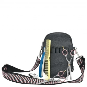 Lässig um die Hüfte oder modisch quer über der Brust getragen, bietet die Crossbag mit breitem Gurt Platz für vier Scheren und alle weiteren benötigten Tools. Alle Scheren tragen einen farblich passenden Akzent mit Fingerringen in der Farbe Rosé.